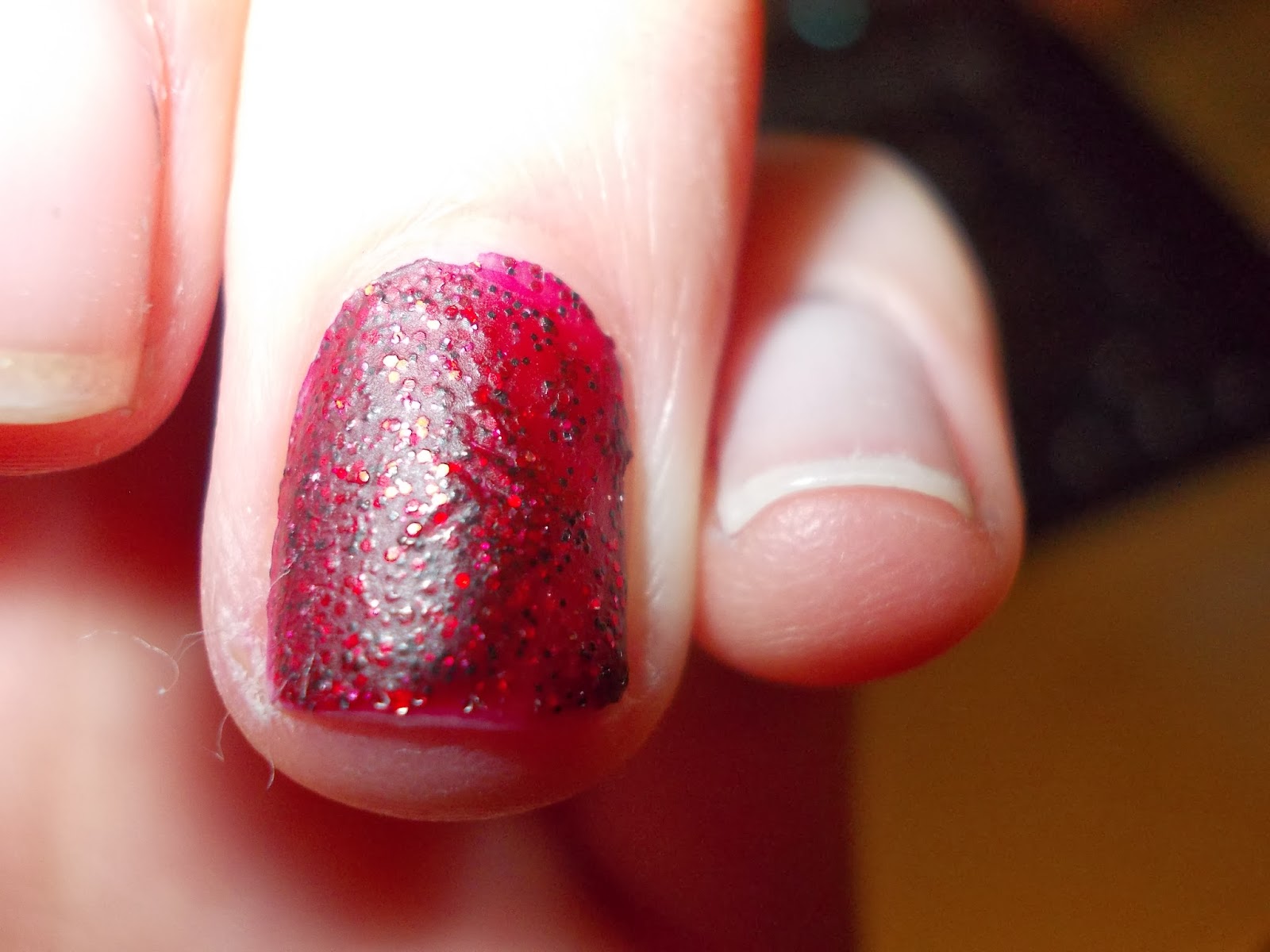 Tökéletesen látszik rajta a fedőlakk - legalább is a képen. Amúgy a vörös annyira dominál, hogy miatta nem látszik. Tanuljatok az esetemből: sötét színre sötét csillámos fedőlakk?SOHA.